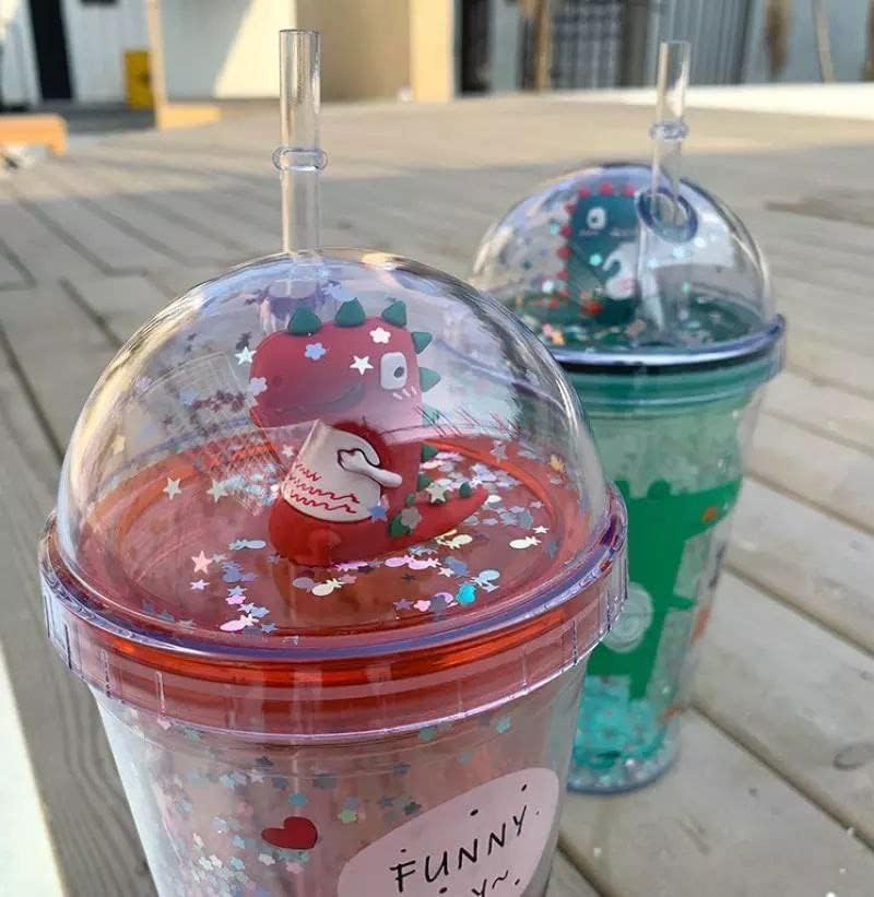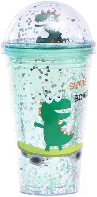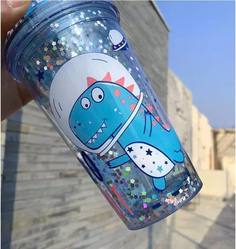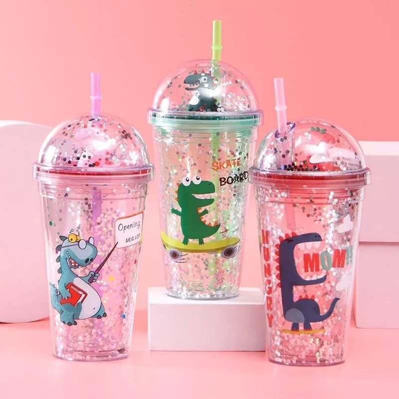 كوب اكريليك بغطاء وشفاطة سعة 450 مل للمشروبات المثلجة بتصميم رائع ومواد فاخرة - ديناصور وحصان يونيكورن - متعدد الالوان