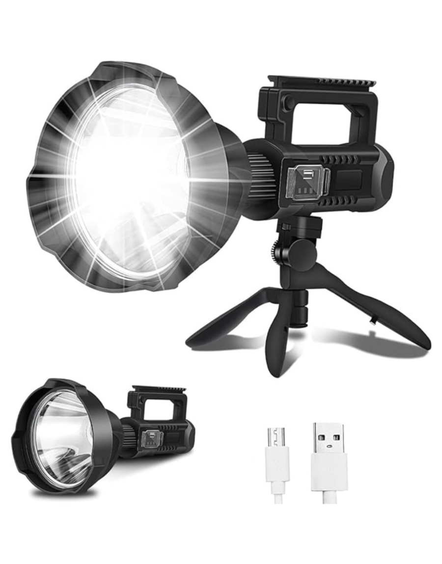 [Strong & Durable]This LED rechargeable spotlight is made of high-quality ABS and Polycarbonate housing, it is very durable and can protect the spotlight from falling and collision during use. Upgrade large size softer switch material makes switch easier to press and has comfortable hand feeling. Includes a folding tripod for hands-free use.