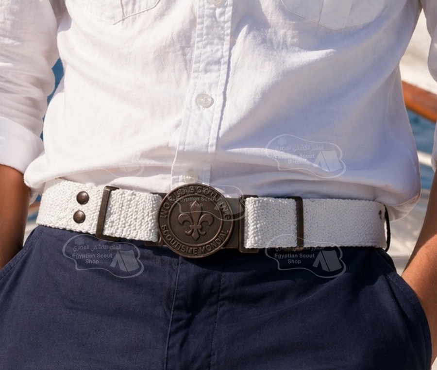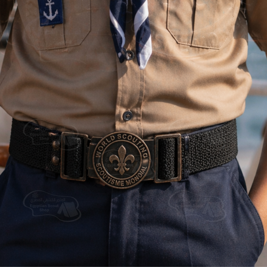 Durable scout belt with premium metal buckle, and classic outdoor design. حزام كشافة متين بإبزيم معدني بتصميم عملي وأنيق للاستخدام الخارجي.