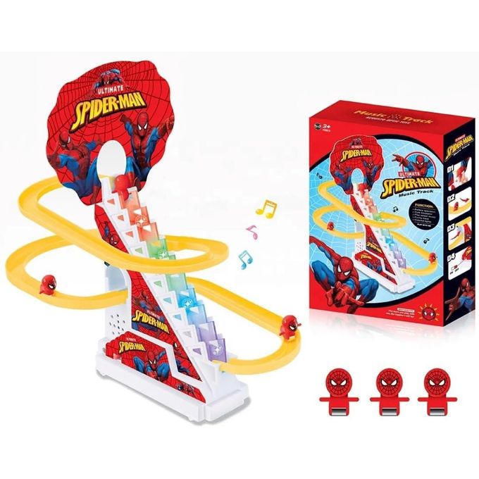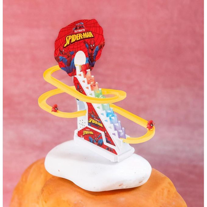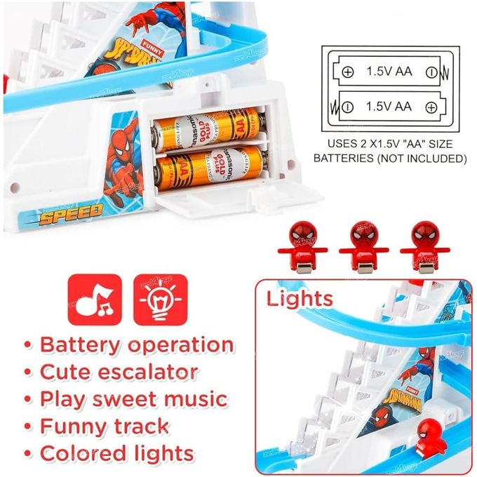 This playset comes with flashing LED lights and is easy to assemble. The game features cheerful music (with an on/off button). 3 happy mini Superhero dolls happily climb the stairs and slide down the slope.